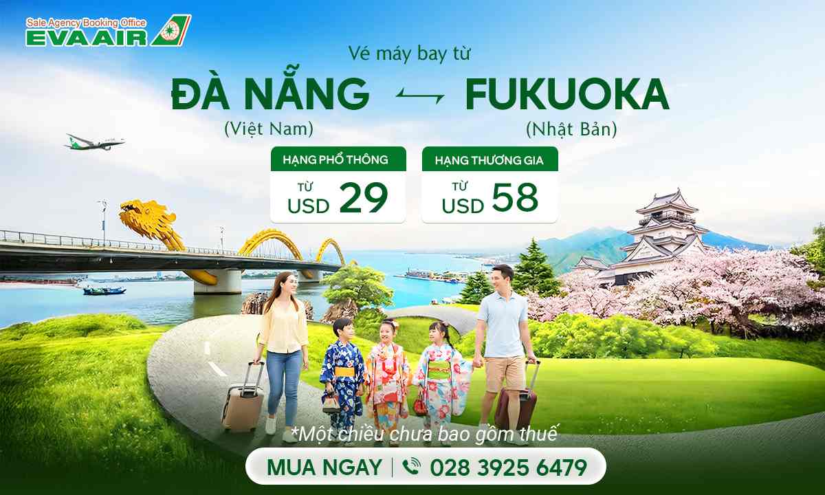 Hãng hàng không EVA Air khai thác chuyến bay đến Fukuoka khởi hành từ sân bay quốc tế Đà Nẵng (DAD) với tần suất 8 chuyến/ngày. Hành khách sẽ quá cảnh tại sân bay quốc tế Đào Viên (TPE) của Đài Loan. Hành khách có nhu cầu đặt vé, vui lòng liên hệ đến văn phòng EVA Air để được tư vấn nhanh chóng nhất.
